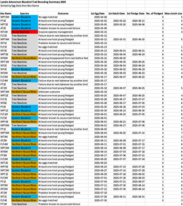 Nonetheless, these positive outcomes for bluebirds and swallows were not enough to overcome the other factors that resulted in an overall nesting decline in our boxes. All nest boxes have received an end of season cleaning. They will be checked again before the 2026 breeding season to see if repairs are needed and to evict any mice.